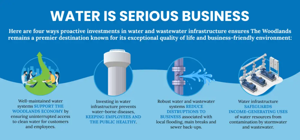 As The Woodlands continues to grow and evolve, its water and wastewater systems face new challenges. Much of the community’s original infrastructure was built decades ago and is now approaching the end of its intended lifespan.